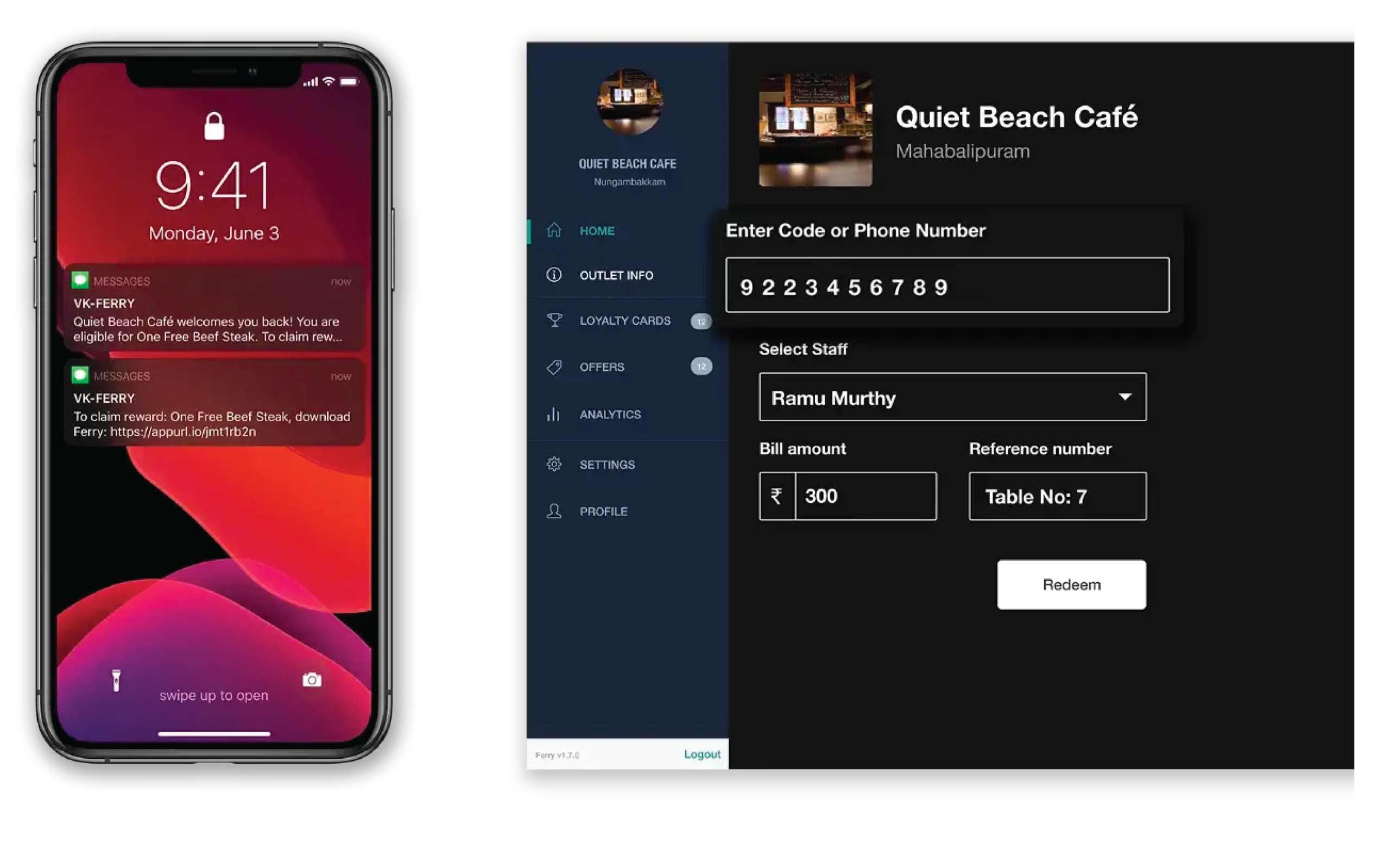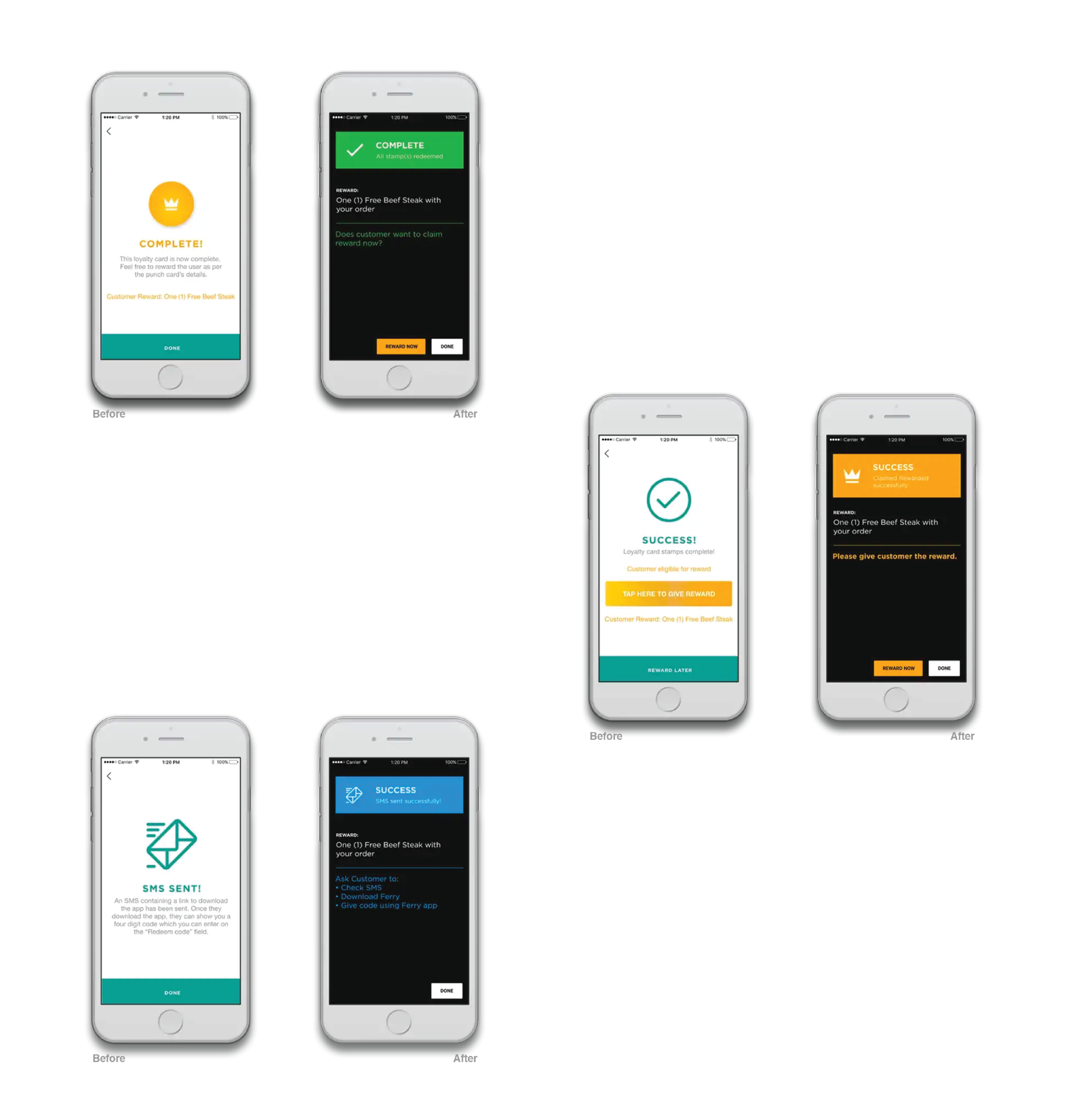 The earlier version required customers to download the Ferry app to redeem any sort of reward program.Over time we began noticing that not all customers were keen to download an app they hadn’t heard of. Despite being keen on rewards, they always had a reason not to download the app at that moment (lack of storage space, “download the next time they visit”, etc.)We figured the best way to approach this would be to input a customer’s mobile number to validate the redeem flow on the Ferry dashboard. This would allow the process to be more effective and efficient and the customer was only encouraged to download the app when they were due for a reward. If they were due for a reward, customers were prompted both by staff and an SMS from our end.This proved successful and we were able to onboard a lot of users using their mobile number.