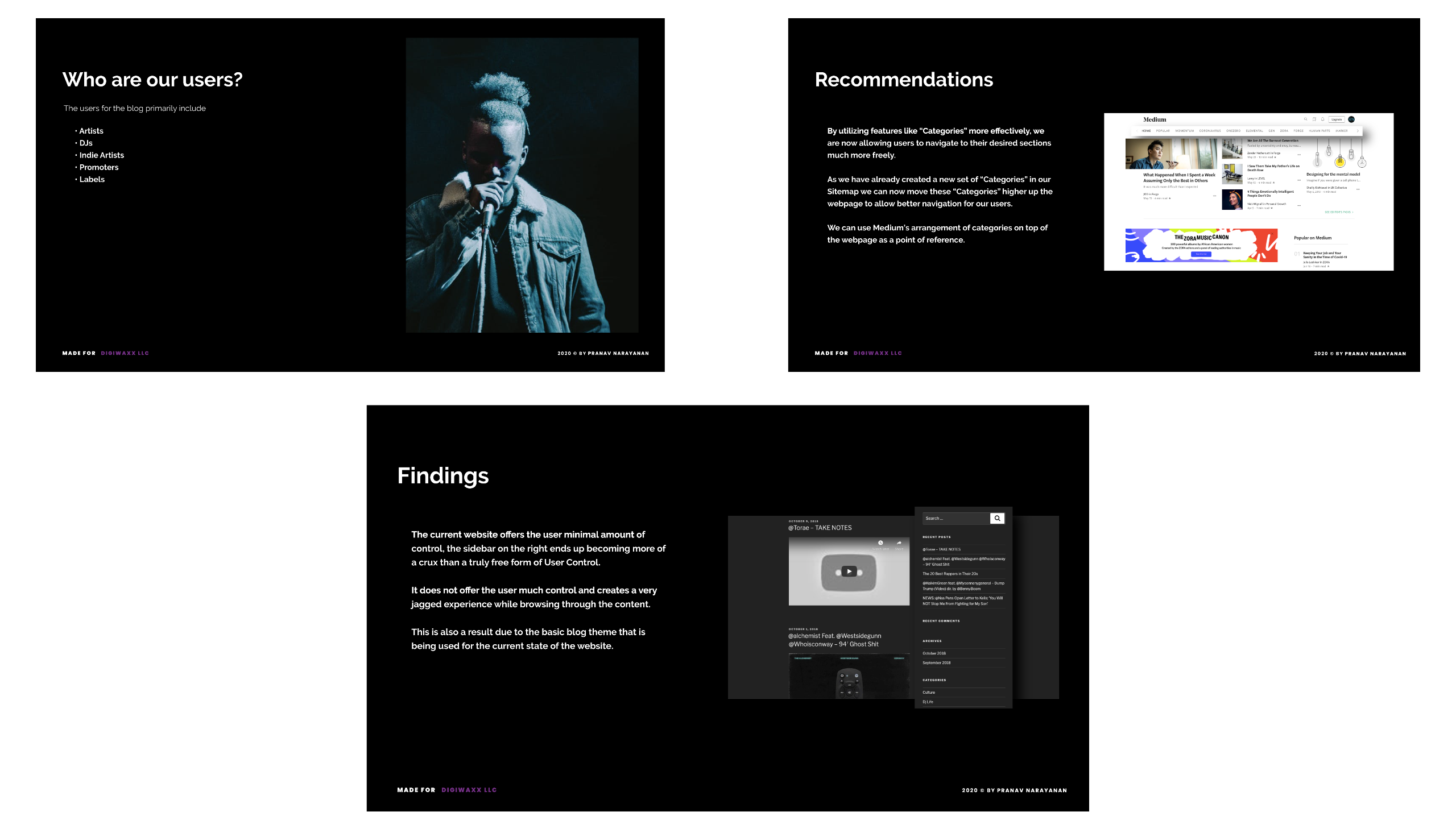 As the Project Manager and one of two UX Designers, I led the Digiwaxx team through discovery, empathy, ideation and design execution. Using those ideas, we narrowed down on the core features the blog must have.This helped me ensure we could construct an effective site flow catered towards our user-base, conduct a heuristic evaluation on the existing blog, produce low fidelity wireframes and high fidelity designs with a prototype for each.