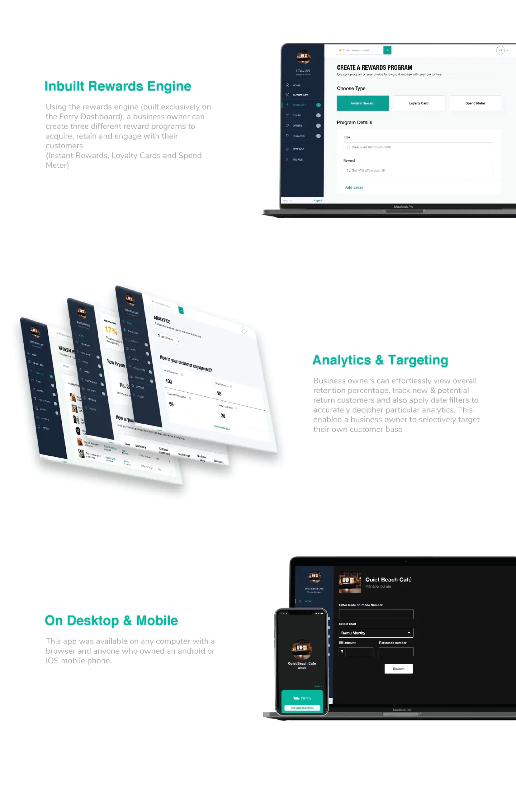 Ferry had a soft/beta launch at the Slate Hotels, which had two outlets catering to food and beverages: — Studio and AYR. The team and I were at the outlet to assist the staff with any questions or hiccups they might have. We also used this opportunity to collect more user feedback from staff members to help in our upcoming iteration process.Staff Members found the current version of the mobile app lightly challenging in their first attempt. They also found the dashboard to be visually overwhelming.We assisted Staff Members in pitching Ferry to customers. Speaking to the staff afterwards, we gleaned that it is imperative, towards their understanding of the product, to have a guidebook, manual or FAQ.Our first version of the Ferry Dashboard on mobile devices showcased analytics and the ability to create content from the home page, this seemed to overwhelm the staff-user.Customers complained, they didn’t have space on their phone for “another app”, to staff members but were very keen on getting rewards for their purchases and visits.