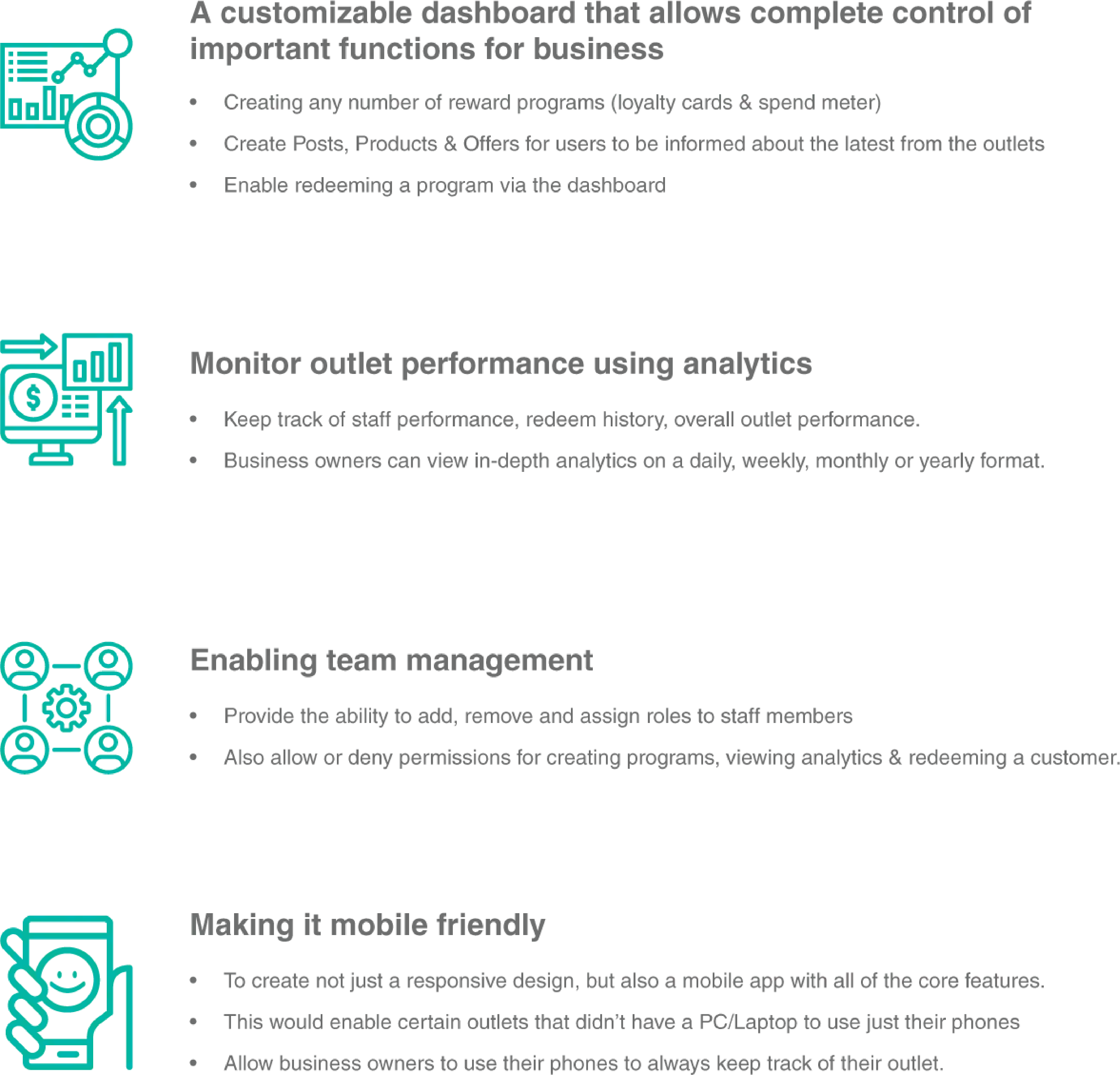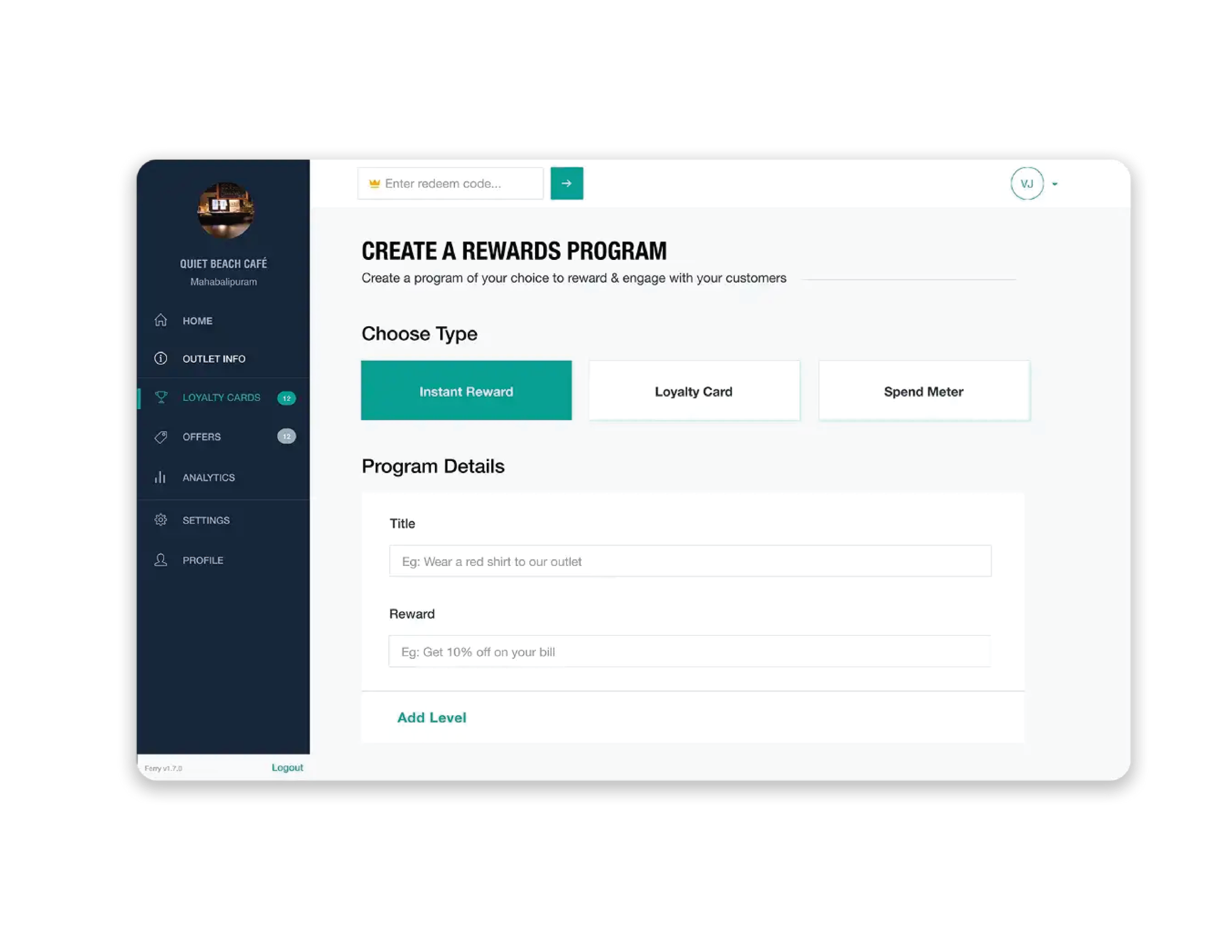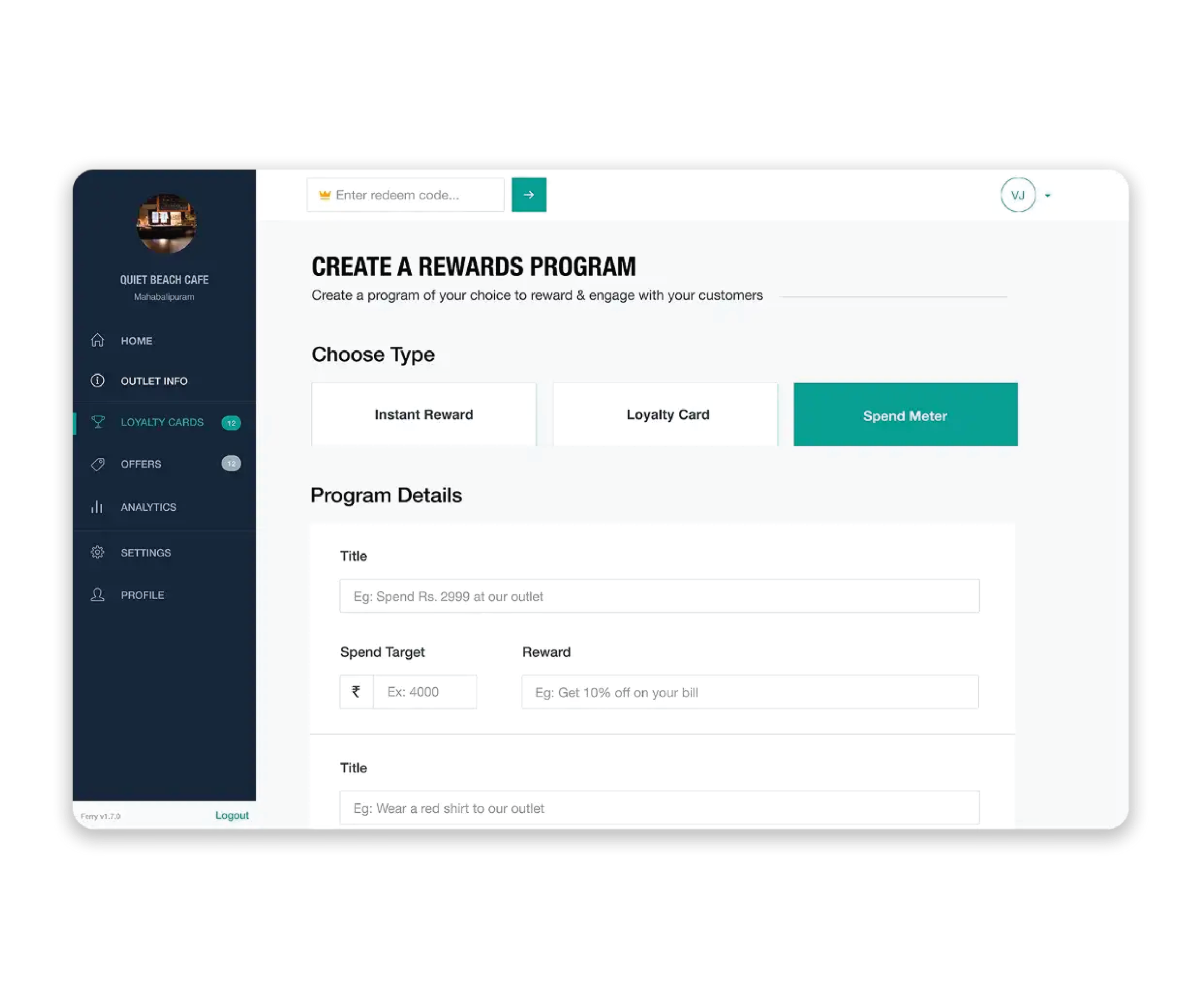 One of our next steps would have been to create a Lite version of the dashboard that accommodated the redeem flow only and this would make the process effortless for the merchant using the Dashboard.The merchant redeeming customers didn’t require features like editing outlet information, analytics & creating a reward program so we decided it would be best to showcase a dashboard that seemed much simpler and easier to use than the current one.Simply put, we wanted to build a feature that would enable businesses to create special and unique programs for their favorite customers. This is something that a lot of business owners expressed to us as they always had a few customers they wanted to keep hold of at all costs.